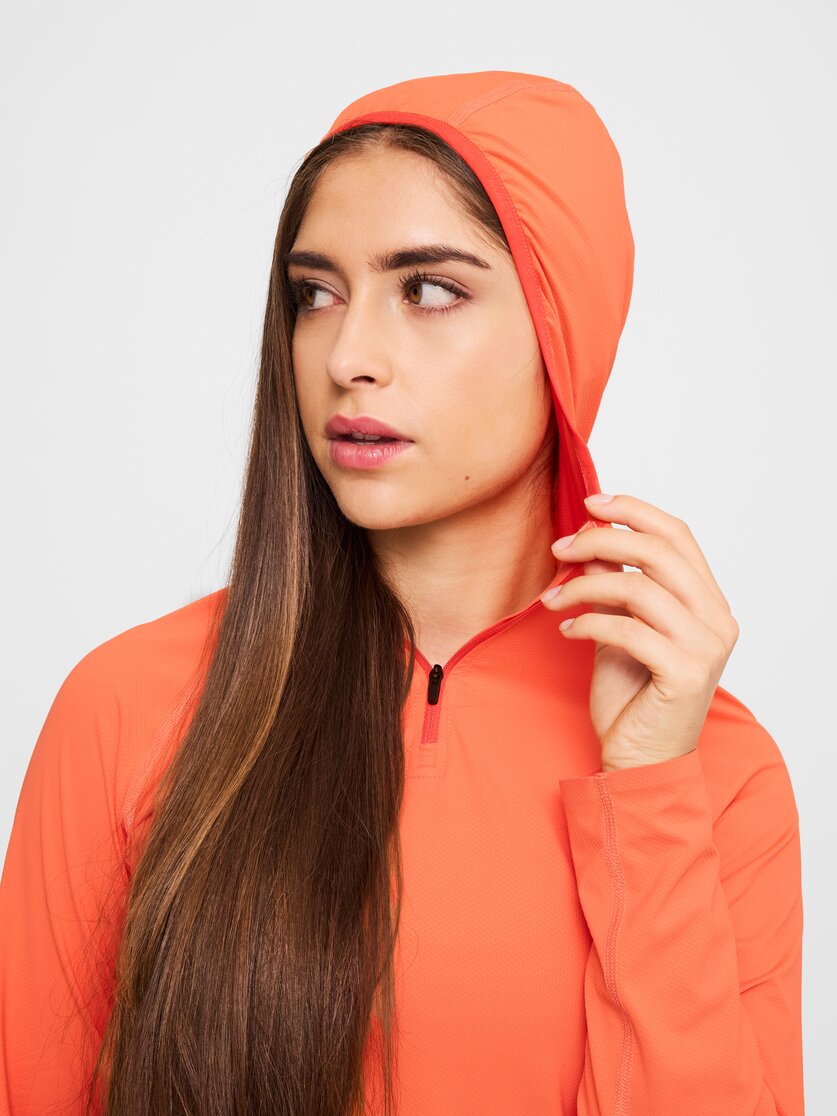 Questa maglia funzionale a maniche lunghe è perfetta per le giornate soleggiate all'aperto dedicate all'attività fisica: il mix di materiali in poliammide riciclata e spandex è molto elastico, trasporta rapidamente l'umidità verso l'esterno ed è comodo da indossare anche durante gli sforzi intensi. Con UPF 50+ offre una protezione affidabile dai raggi UV, mentre il cappuccio garantisce un comfort aggiuntivo in caso di vento o in cresta. Pratica durante le escursioni è la breve zip frontale, che consente di regolare rapidamente la ventilazione, mentre gli orli incollati garantiscono una finitura pulita senza ingombri inutili. Sul cappuccio, i bordi elastici ne sostengono la vestibilità, in modo che tutto rimanga al suo posto durante il movimento. A ciò si aggiunge una finitura Polygiene che inibisce la formazione di odori, ideale quando le corse e le escursioni in montagna si protraggono più a lungo. La Hillclimb Protec Hooded Shirt W è quindi un capo versatile e performante per tutti coloro che amano correre o fare escursioni in montagna.